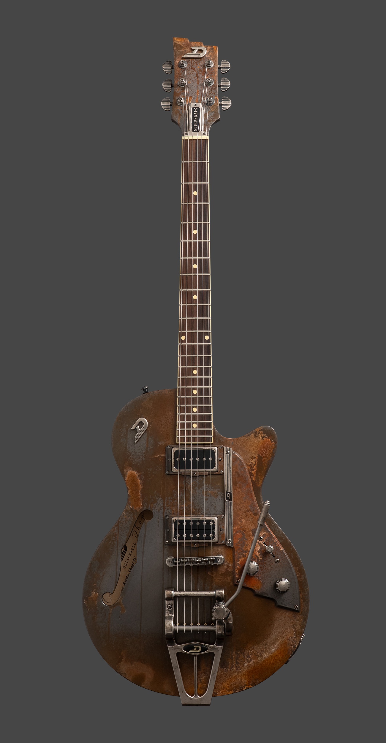 Semi-Hollow construction made from wood and finished with a real, magnetic layer of metal particles. Every piece is aged and processed by hand to achieve the unique Rusty look.
